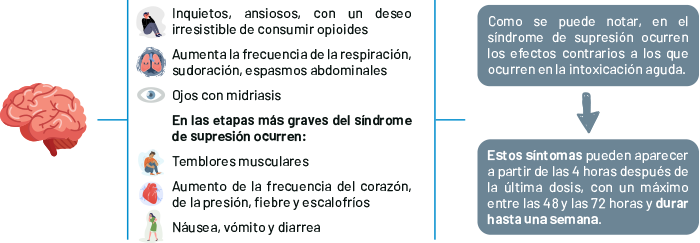 Los efectos de la sobredosis incluyen los siguientes: Como se mencionó anteriormente, el resultado de la estimulación de los “receptores de opioides” causa disminución en la función del sitio donde están, por lo que además puede ocasionar disminución: ![]() Efectos a largo plazo El consumo a largo plazo de opioides ocasiona que, como un mecanismo reactivo del cuerpo, disminuyan los “receptores de opioides”, lo que explica el síndrome de abstinencia, ya que cuando no se está bajo los efectos de la droga, el cuerpo tiene menos efecto supresor de estos receptores, causándoles síntomas de hiperactividad en el sistema nervioso central, los usuario están: ![]() ![]() Efectos a corto plazo