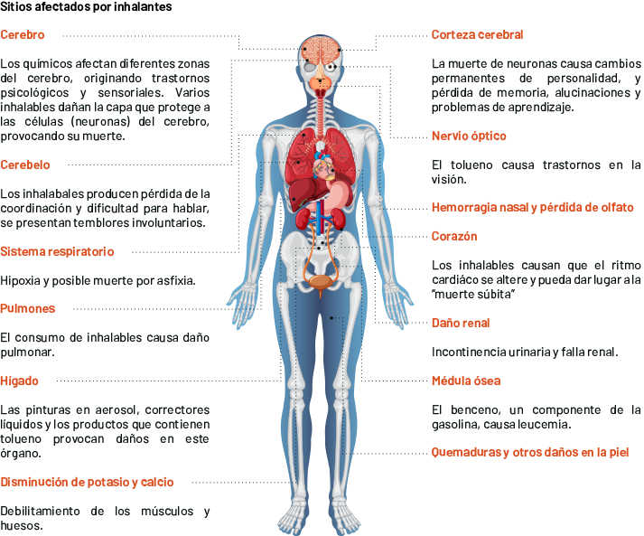 Estas sustancias pueden afectar el corazón, lo que puede ocasionar que lata rápidamente y se altere la forma en que hace sus latidos (el ritmo) lo que puede llevar a infartos y muerte súbita. Otros efectos se pueden dar en: Riñones: El tolueno es un grupo especial de solvente que afecta los tubos del riñón, lo que puede ocasionar pérdida del potasio, esto afecta el corazón (otra causa de infarto), y causa parálisis de los músculos.