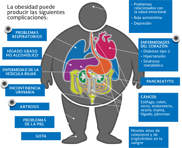 El sobrepeso y la obesidad son factores de riesgo para numerosas enfermedades crónicas, entre las que se incluyen la diabetes, las enfermedades cardiovasculares y el cáncer. La obesidad puede disminuir tu calidad de vida general. Es posible que no puedas hacer cosas que hacías antes, como participar en actividades placenteras. Tal vez evites los lugares públicos. Las personas obesas incluso pueden sufrir discriminación.